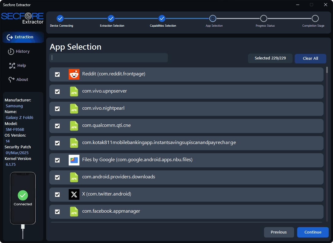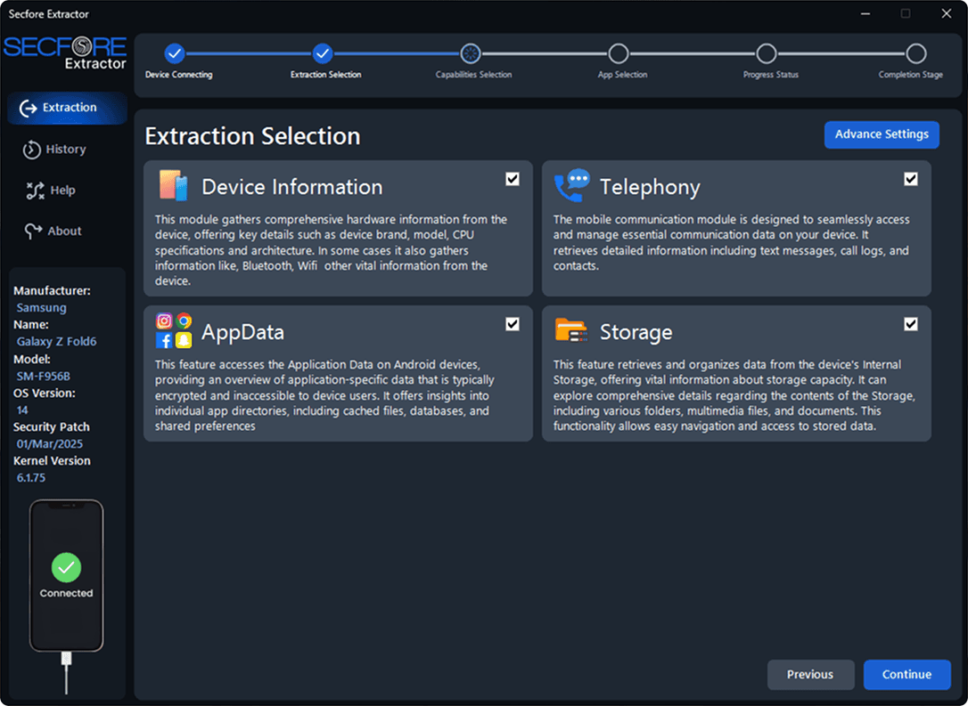 Secfore Extractor is a plug-and-play forensic acquisition tool. Connect a device, select what you need, and extract. No external hardware, no complex setup. It supports the latest Android and iOS devices across 20+ manufacturers, with SHA-256 hash verification built into every extraction for court-ready evidence.