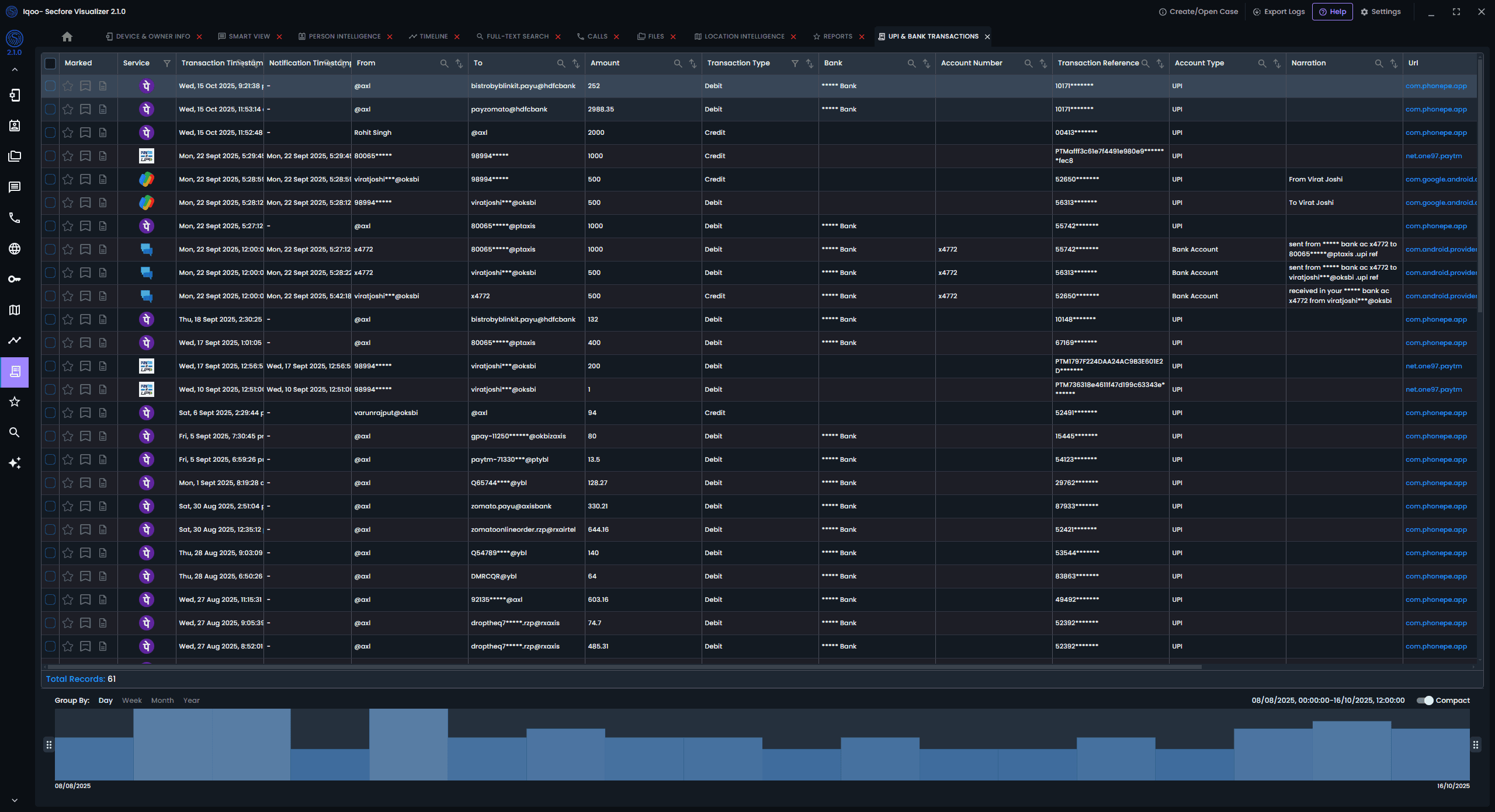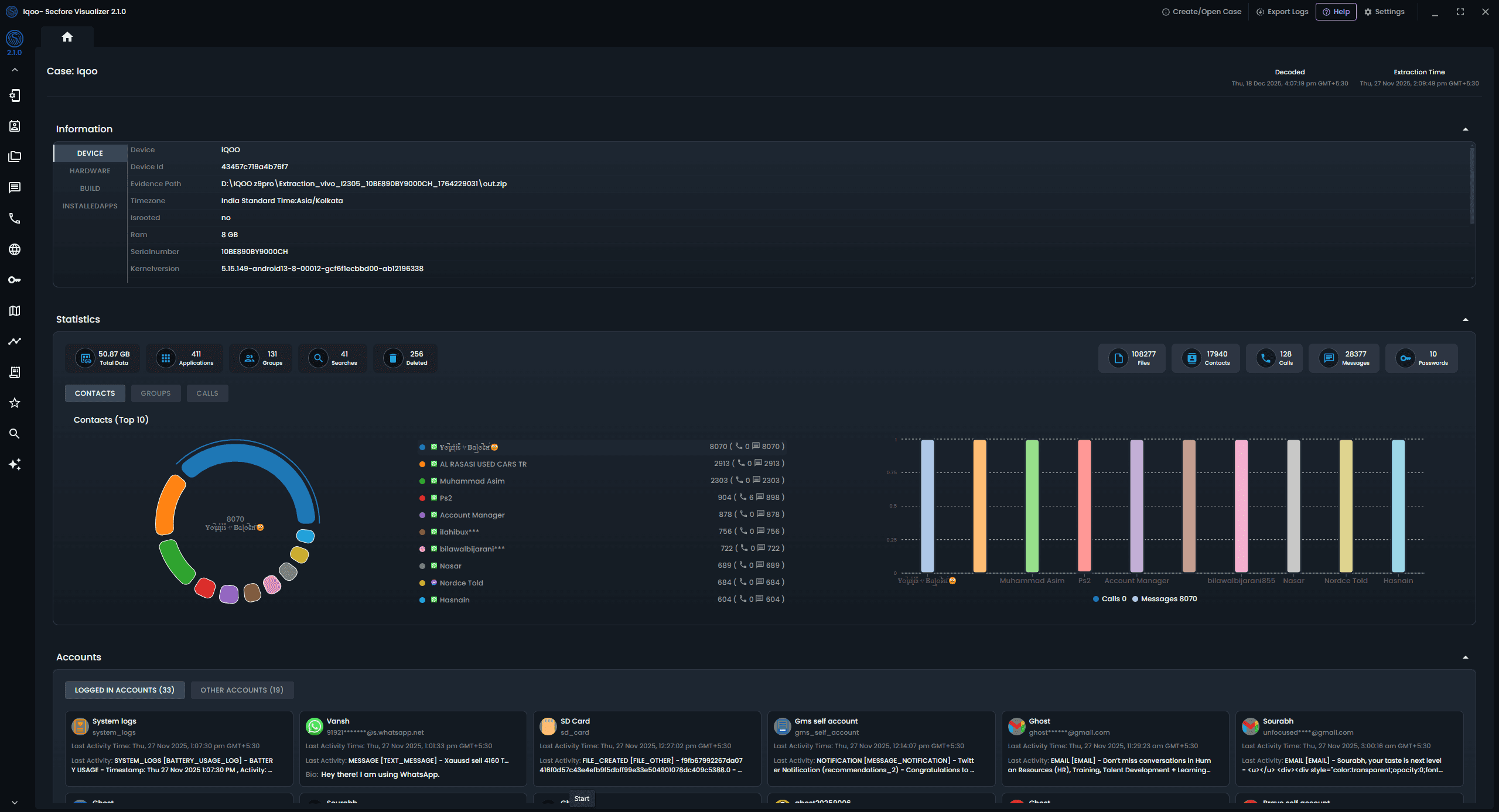 Secfore Visualizer is where extracted evidence becomes investigation intelligence. 14+ analysis modules — timeline reconstruction, cross-app communications, location mapping, UPI transaction tracing, and person-centric profiling — all in one interface.