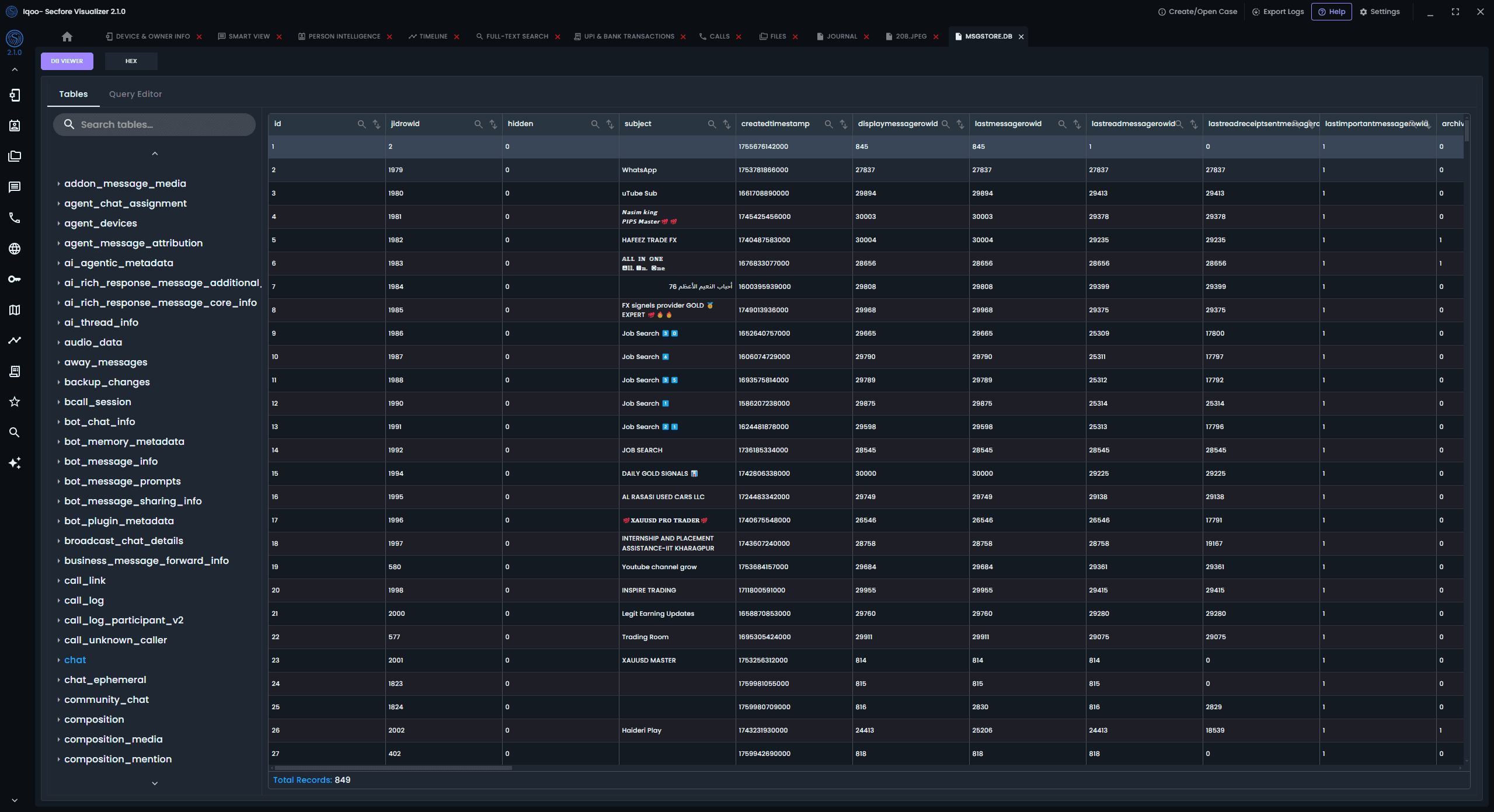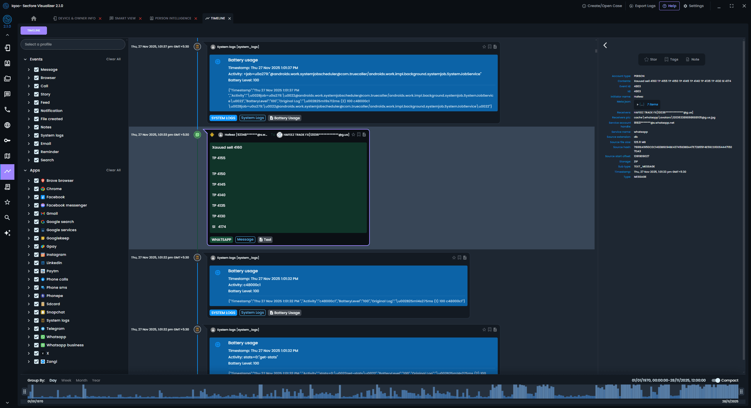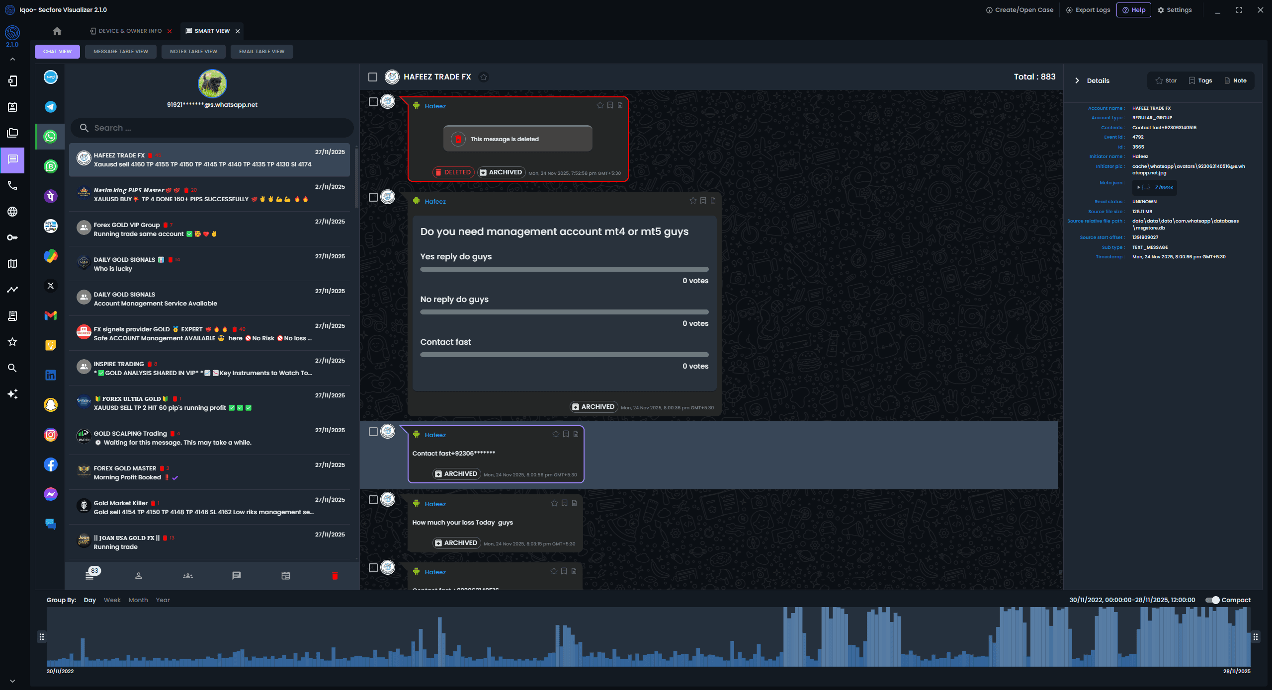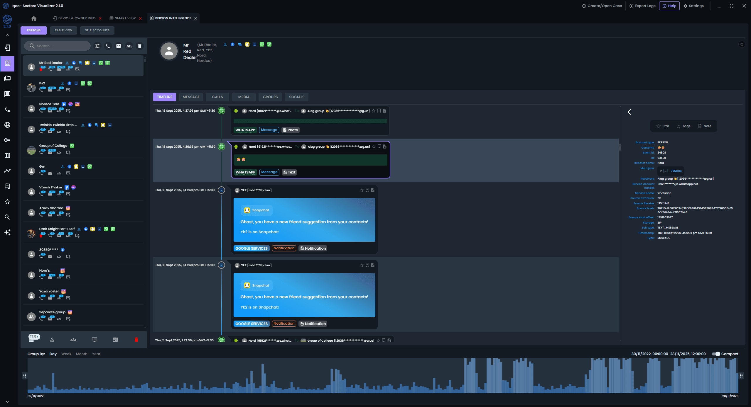 Reconstruct conversations exactly as they happened. Browse chats across apps in one place view full threads with media, analyze metadata, and uncover deleted messages and group chats — all from a single, unified screen with powerful search timeline view UX